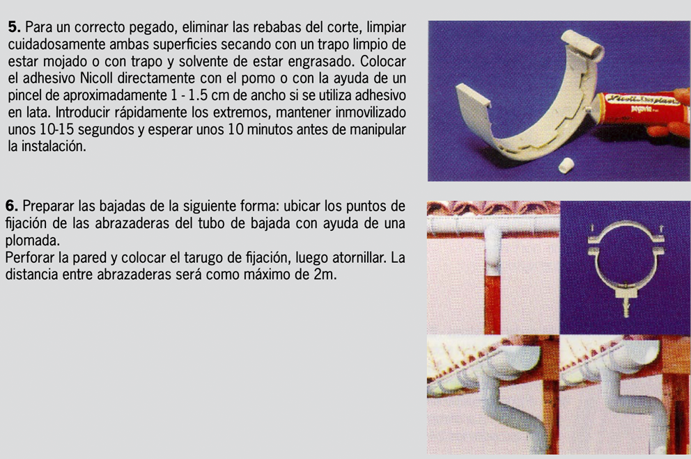 Recordar que cada tubo de bajada asegura la evacuación de hasta 10m2 de superficie, o bien, 12m lineales de canaleta. Ejemplo: Para un techo a un agua de 12m de frente x 10m de fondo= 120m2 de superficie, se requiere una sola bajada. Los sistemas de Canaletas Plásticas de Nicoll están pensados para solucionar todas y cada una de las variantes posibles, adaptándose perfectamente a sus requerimientos.
