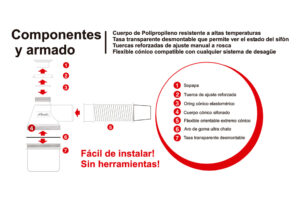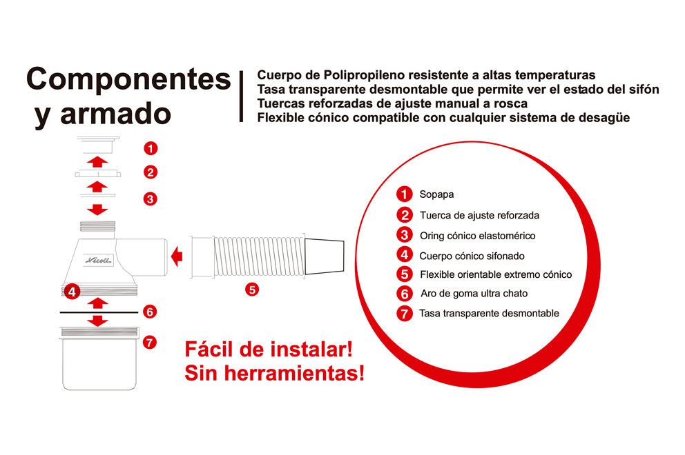 Posee un cuerpo de polipropileno resistente a altas temperaturas. Su tasa transparente desmontable, permite ver el estado del sifón. Es compatible con cualquier sistema de desagüe.